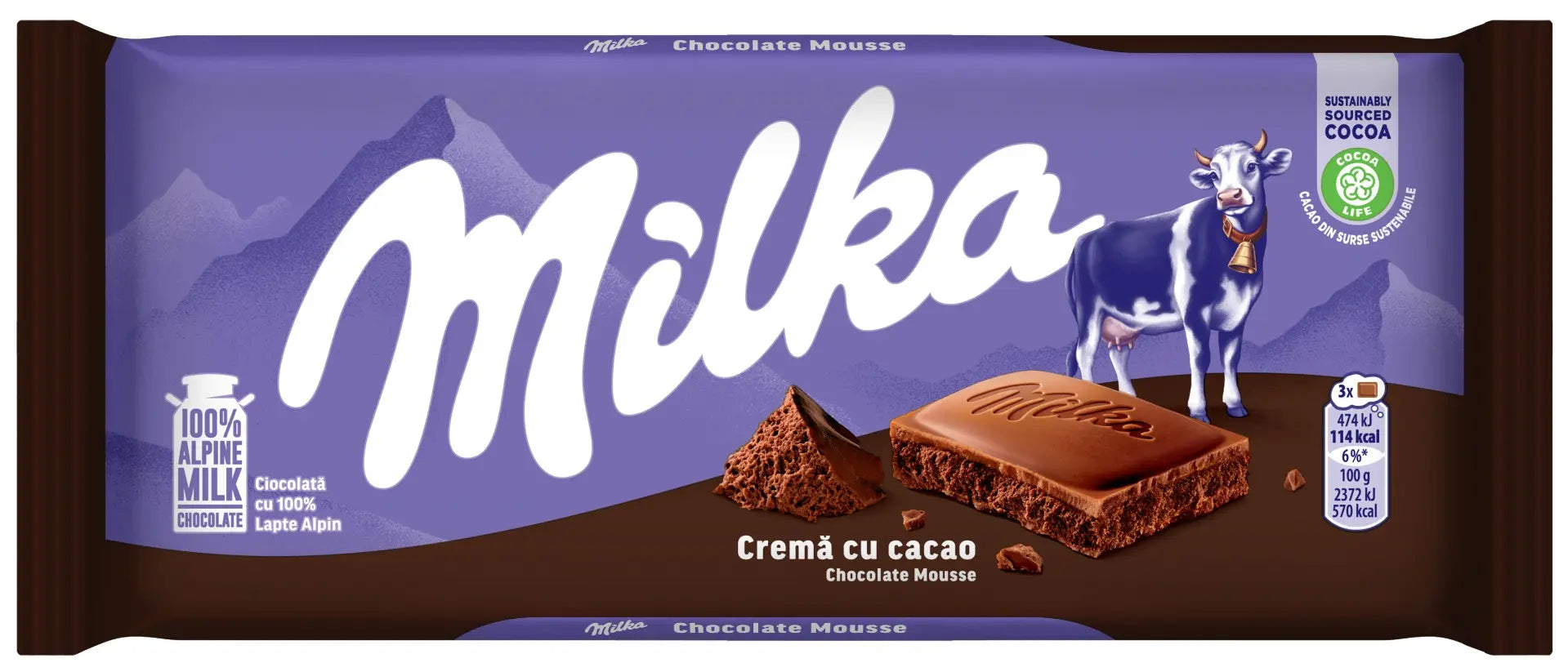 Milka Crema cu Cacao features smooth Alpine milk chocolate filled with a soft cocoa cream centre. Rich, creamy and delicately balanced for an indulgent chocolate experience.