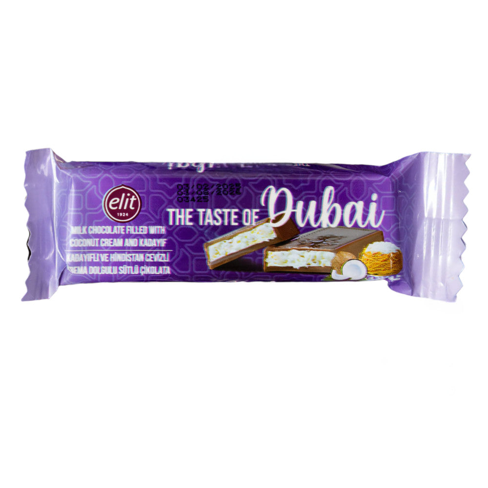 Indulge in the luxurious taste of Elit Dubai Milk Chocolate, filled with velvety coconut cream and crispy kadayif. A rich fusion of Middle Eastern tradition and premium chocolate craftsmanship in a 30g bar.